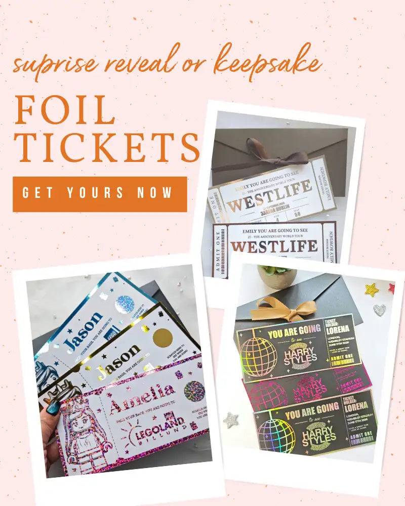 Create unforgettable surprise moments with our personalised foil tickets. From concert experiences to holiday adventures, match day surprises to romantic date nights, our luxury reveal tickets turn any announcement into pure magic. Each ticket features genuine gold or glitter foil and can be fully customised with names, destinations, and special details. Perfect for birthday surprises, kids' special moments, Christmas morning reveals, or celebrating achievements. Popular designs include Legoland tickets, Disneyland Paris surprises, K-Pop concert tickets, football match reveals, cruise announcements, and Hogwarts acceptance letters. We also offer scratch-off reveal tickets and comedy show tickets. Hand-finished in our Irish studio on premium card stock, these aren't just tickets - they're keepsakes to treasure forever. People across Ireland use our surprise tickets to create those jaw-dropping moments that are talked about for years. Complete with presentation envelope. Made in County Cork with love and posted within 2-5 working days.