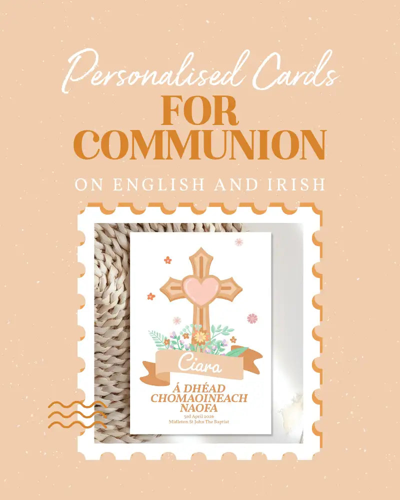Beautiful personalised communion cards, available in English and Irish and printed with care in Ireland. Designed to honour the day with simplicity, meaning, and lasting quality.
