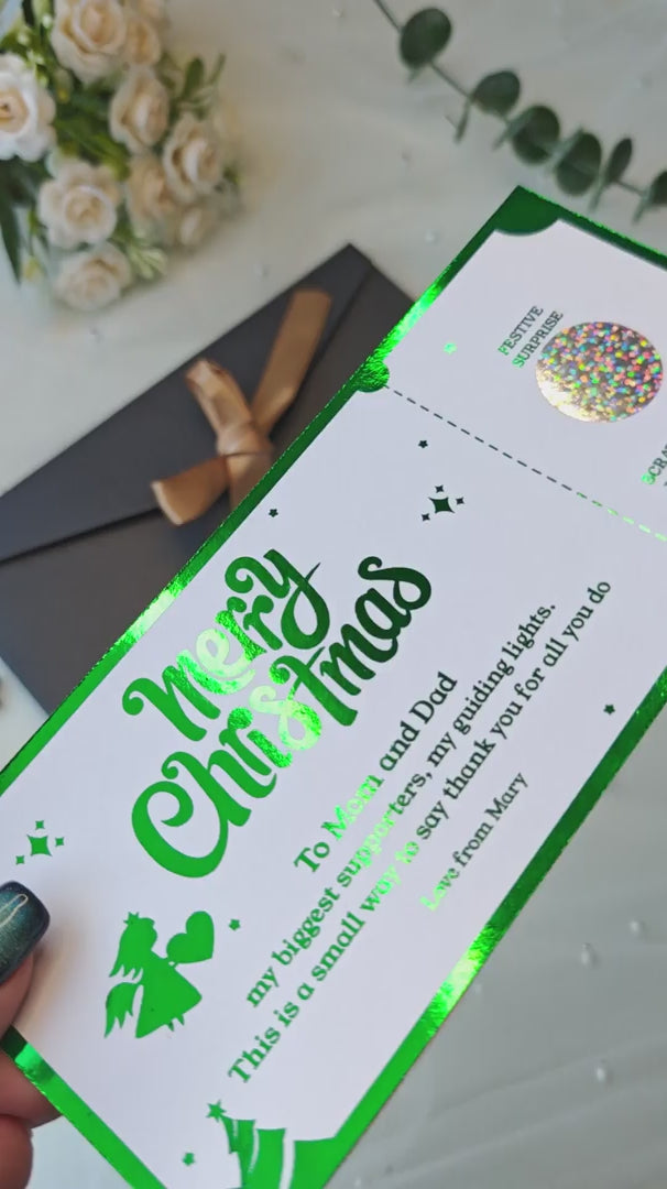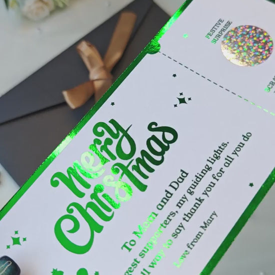 Our personalised Christmas foil scratch-off tickets are the perfect way to add magic to the festive season. Handmade in County Cork, Ireland by Printarelle, these luxury keepsakes combine elegant foil with a heartfelt, customisable design.