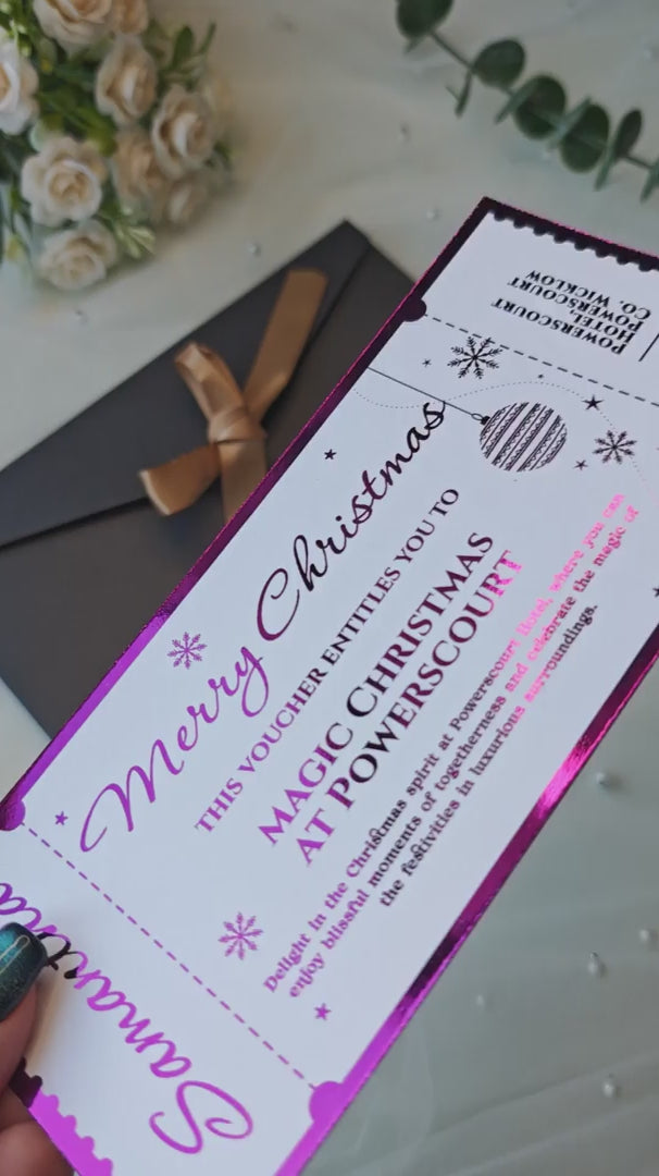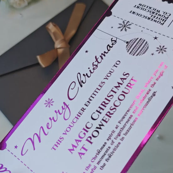 This personalised Christmas foil ticket is the perfect way to make your festive surprise unforgettable. Handmade in County Cork, Ireland by Printarelle, each keepsake combines shimmering foil design with heartfelt customisation. Ideal for gifting hotel stays, weekend getaways, or special Christmas surprises.