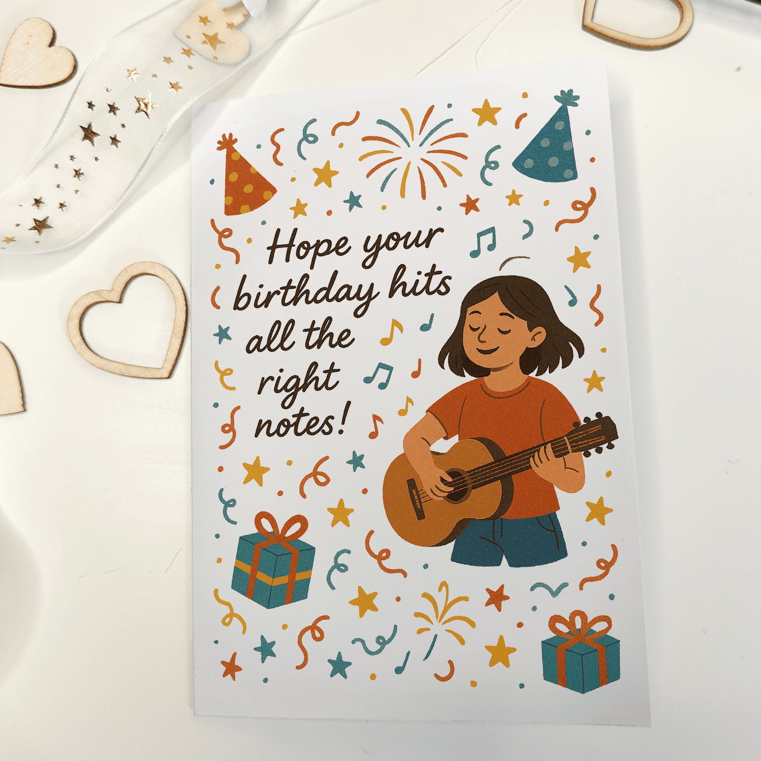 Make their birthday sing with this joyful music-themed birthday card. Featuring a happy guitarist illustration and a playful pun, this card is perfect for anyone who loves strumming chords or humming tunes on their special day.