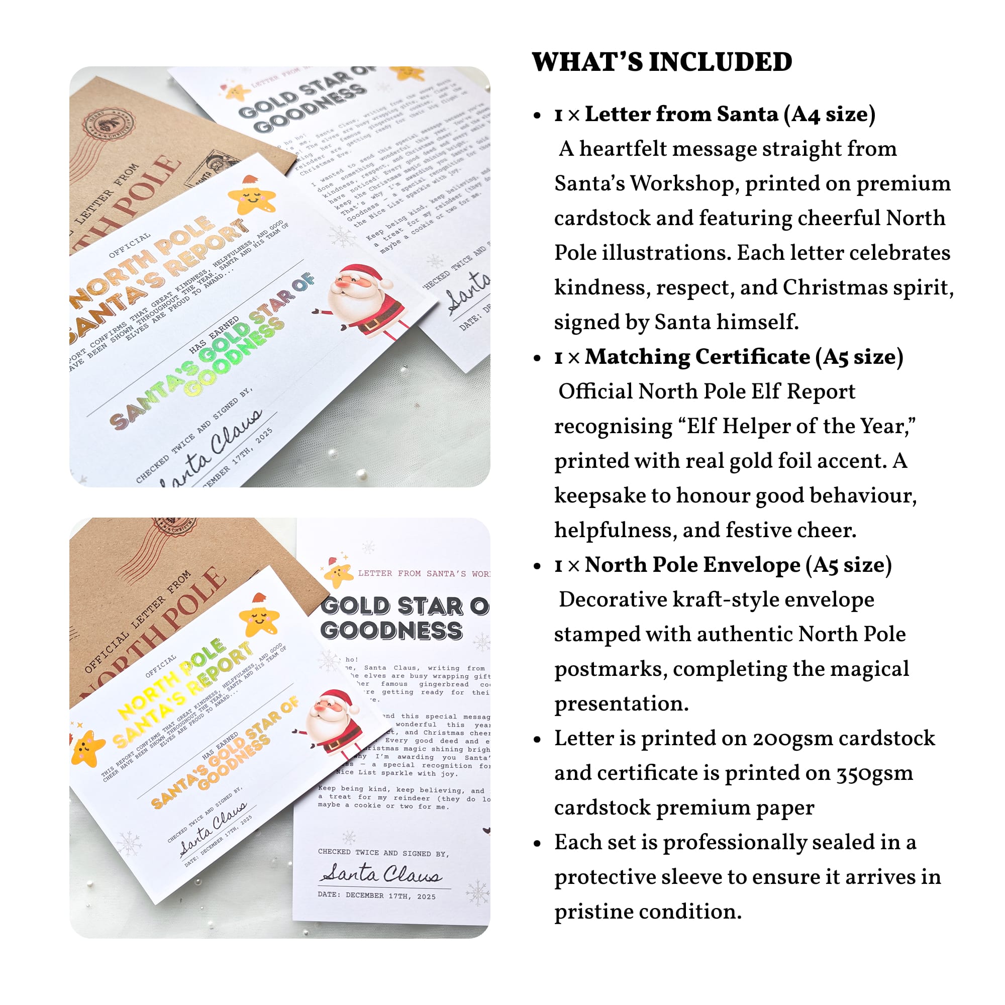 Celebrate kindness and festive spirit with the Gold Star of Goodness Letter from Santa — a joyful keepsake handmade in Ireland by Printarelle. This special set includes a cheerful letter from Santa, an official North Pole Elf Report Certificate, and a decorative kraft envelope stamped with authentic North Pole postmarks.