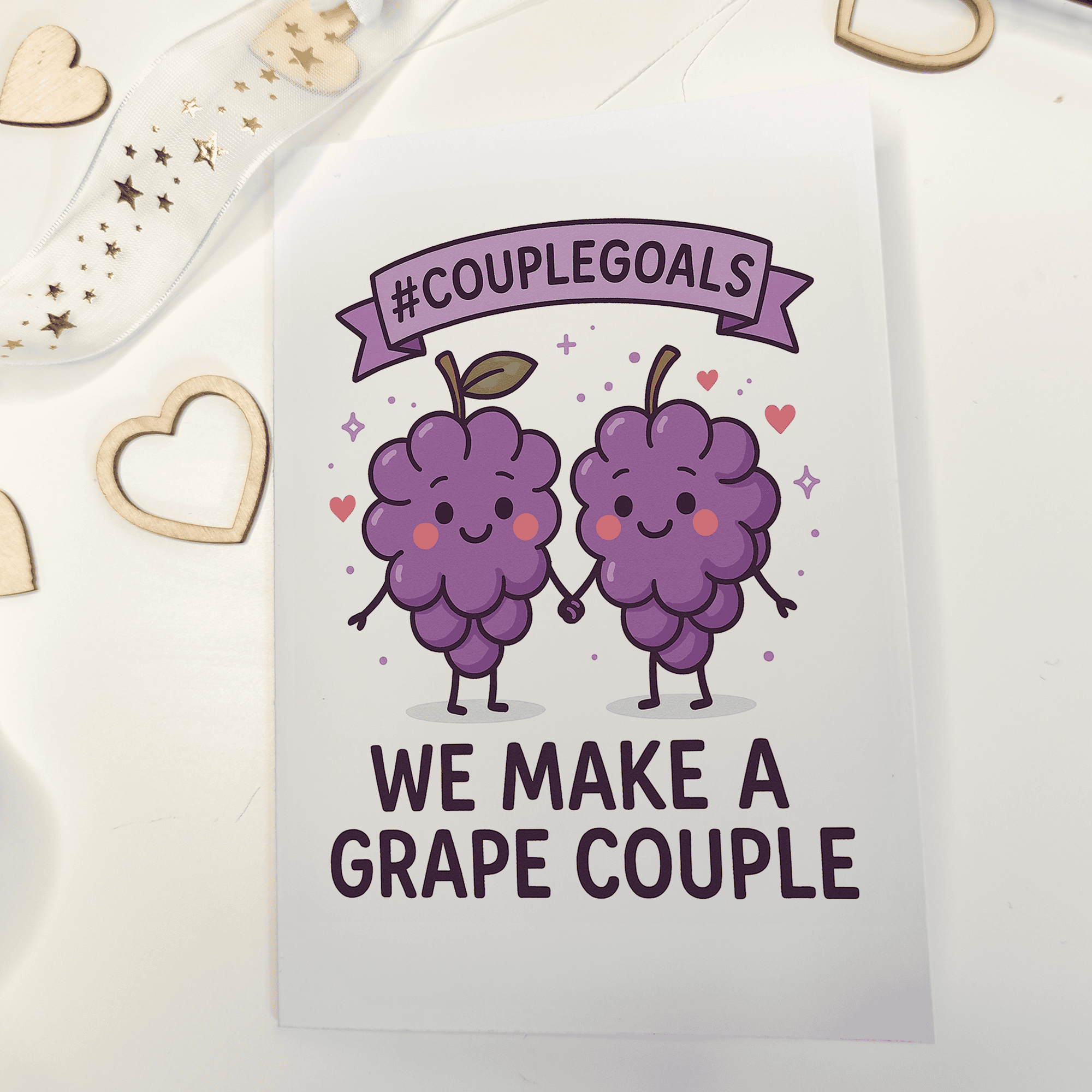Let your partner know how *grape* they are with this adorable food pun couple card! Featuring two smiling grapes holding hands under a #COUPLEGOALS banner, this charming card is perfect for Valentine’s Day, anniversaries, or just to say “I love us.”
