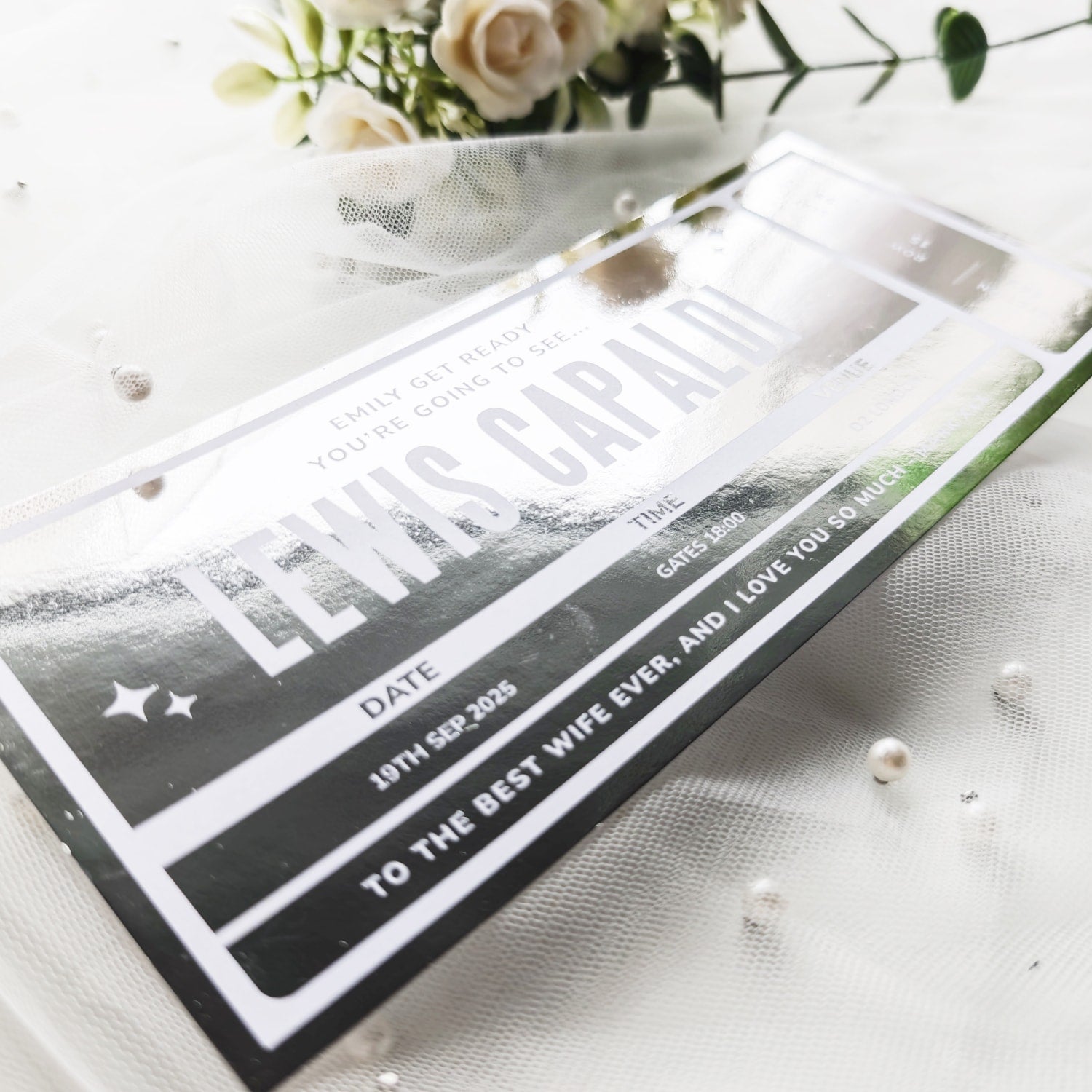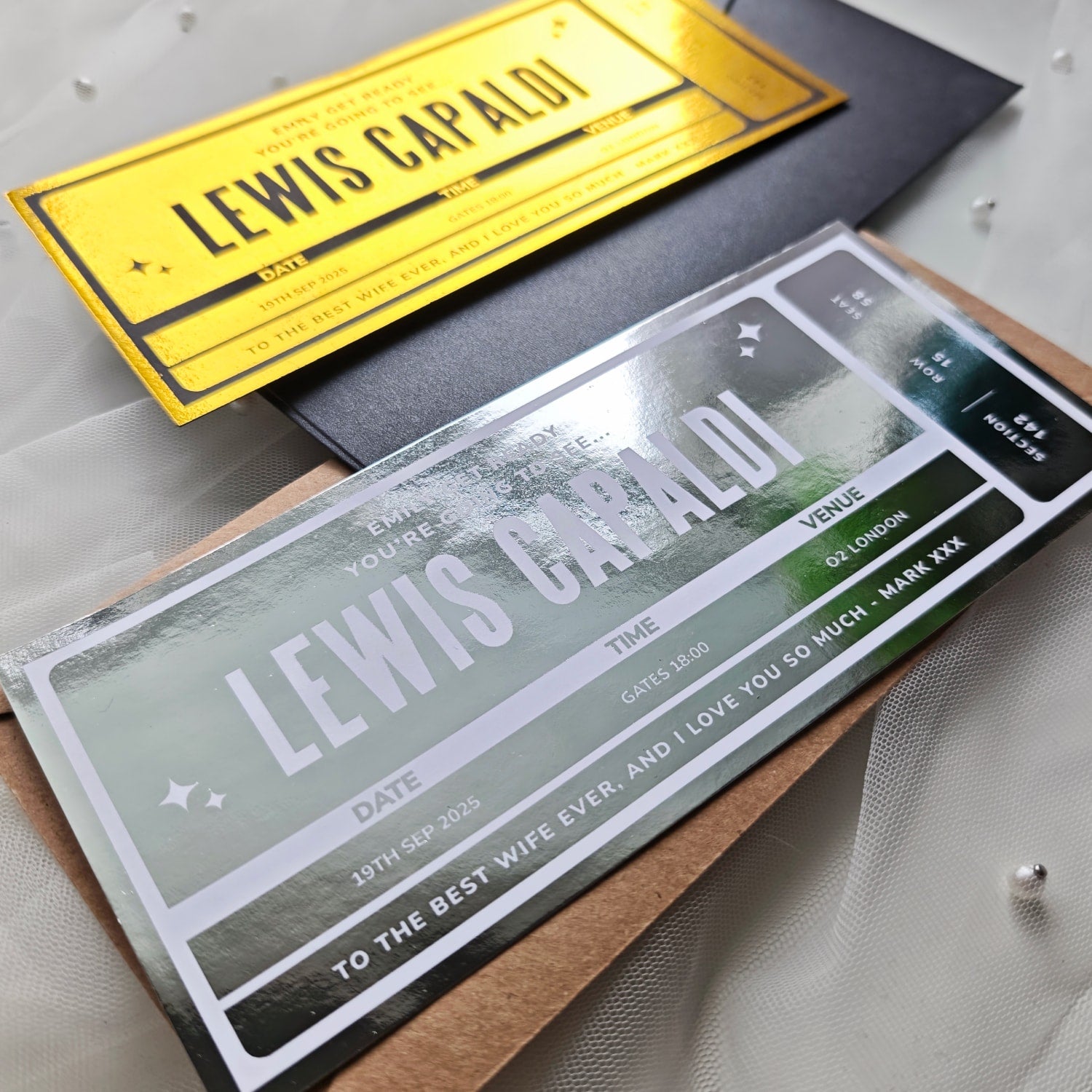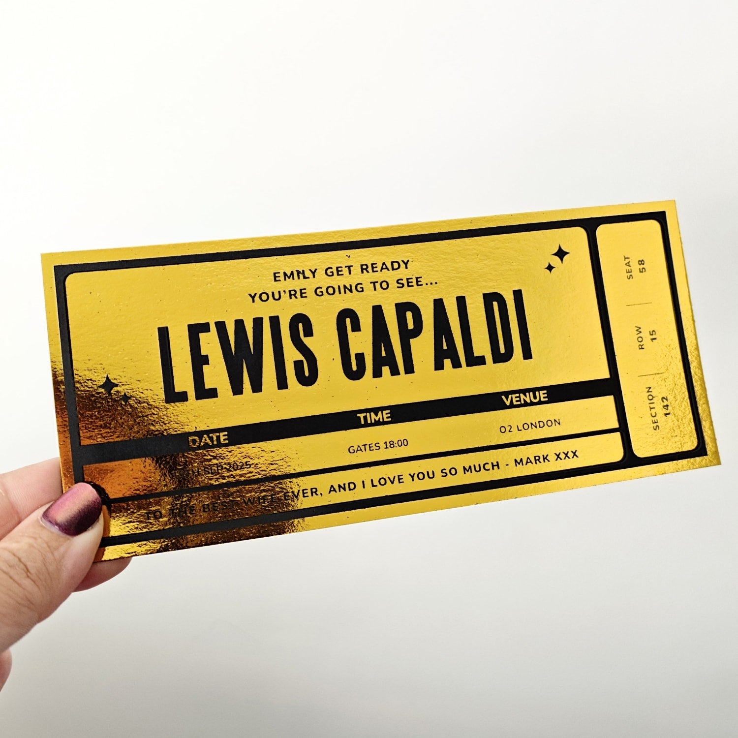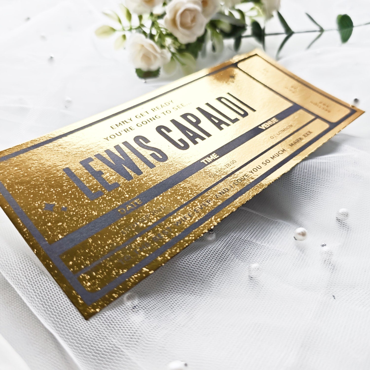 Celebrate an unforgettable moment with a personalised Lewis Capaldi foil concert ticket, handmade in Ireland by Printarelle. Styled like a real event pass with shimmering metallic foil, this keepsake is the perfect way to announce concert tickets or create a meaningful gift for any music lover.