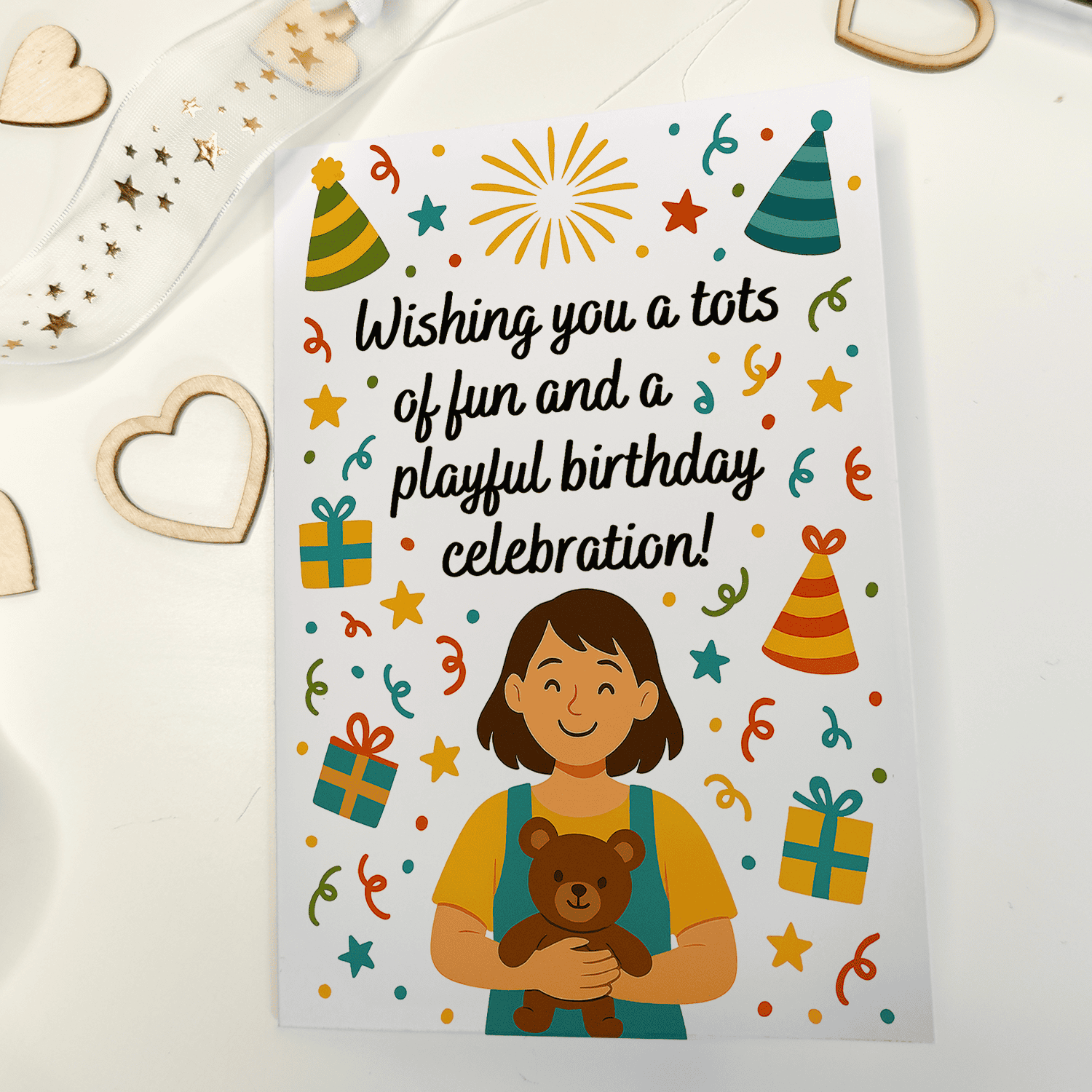 Brighten a nanny’s or childcare worker’s birthday with this sweet and joyful card. Featuring the playful message “Wishing you a tots of fun and a playful birthday celebration!”, this design brings smiles and warmth to those who care for little ones every day.