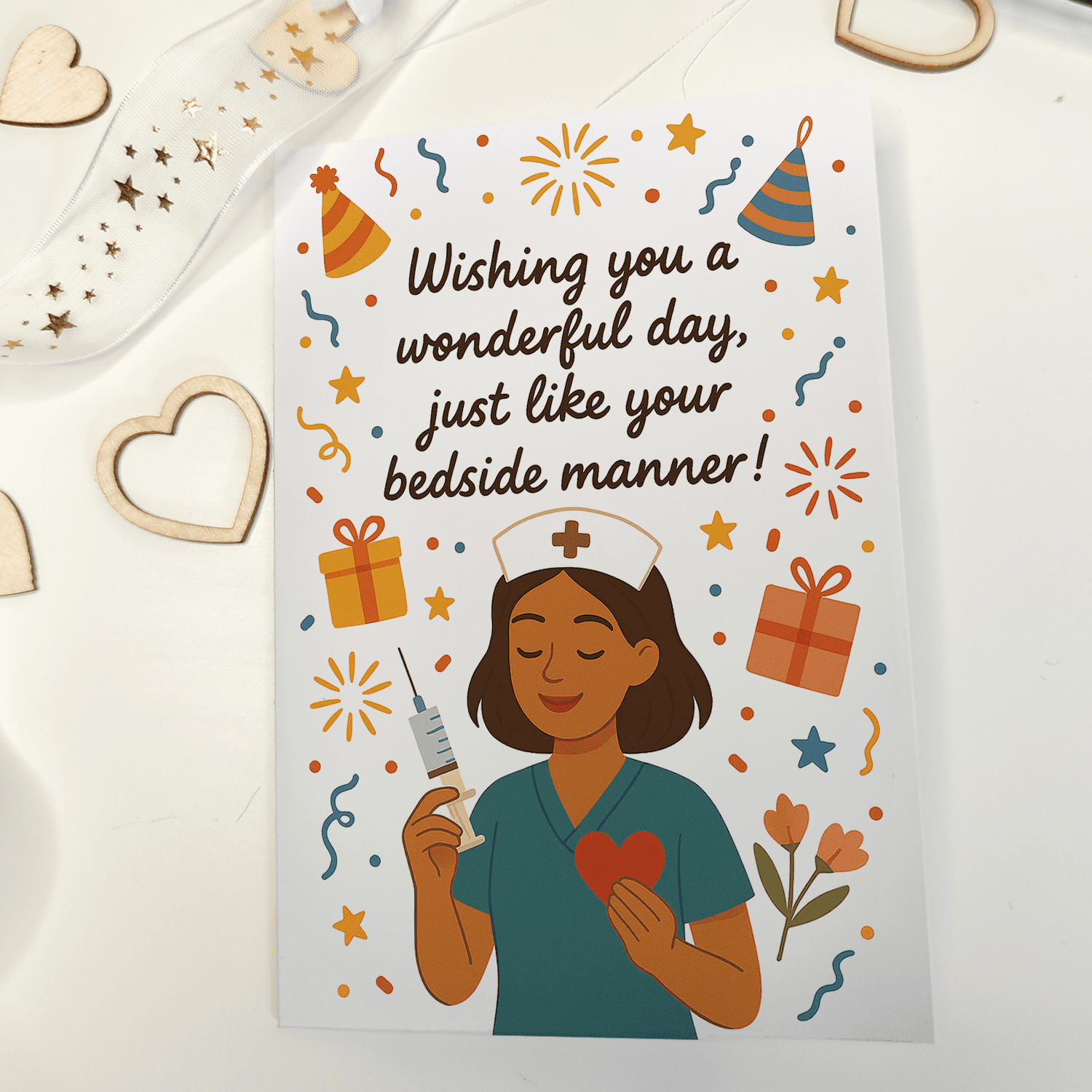 Celebrate the caring heart behind every shift with this thoughtful nurse-themed birthday card. Featuring a calm, cheerful nurse illustration holding a heart and syringe, plus the message “Wishing you a wonderful day, just like your bedside manner!”—this card is a heartfelt way to honour someone in healthcare.