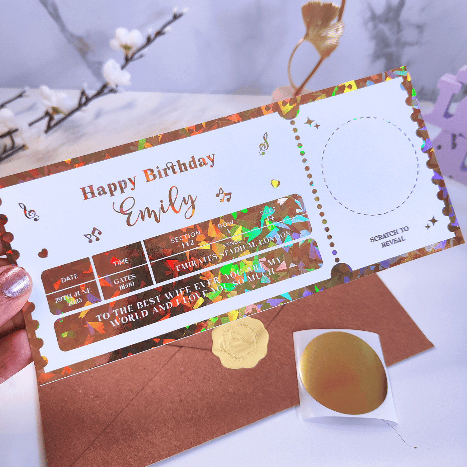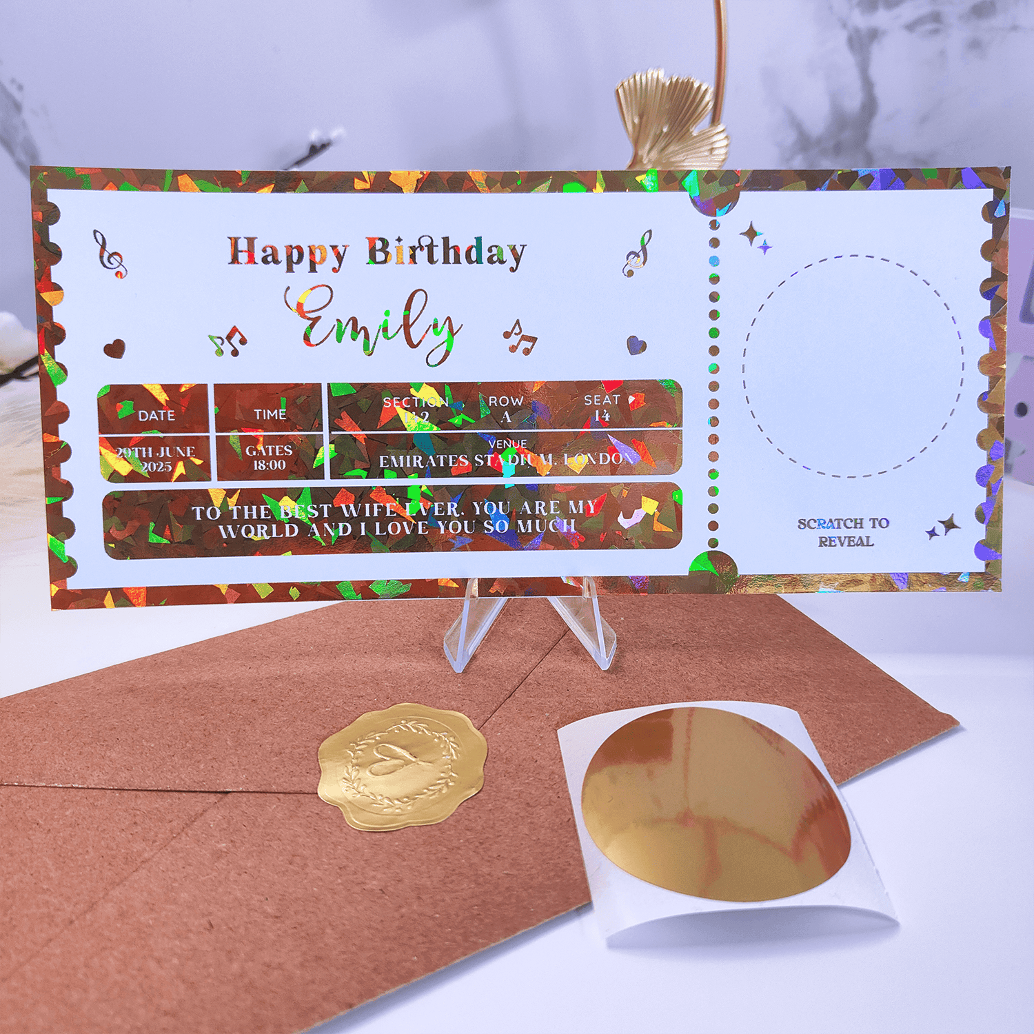 Give the gift of excitement with a personalised foil birthday surprise ticket. Handmade in Ireland by Printarelle, this keepsake looks like a real event pass and features a hidden scratch-off reveal for your custom message. Perfect for birthdays of all ages, it transforms your surprise into a memorable experience.