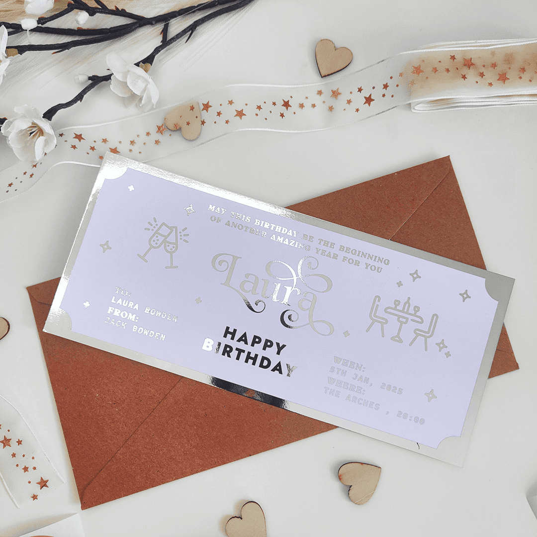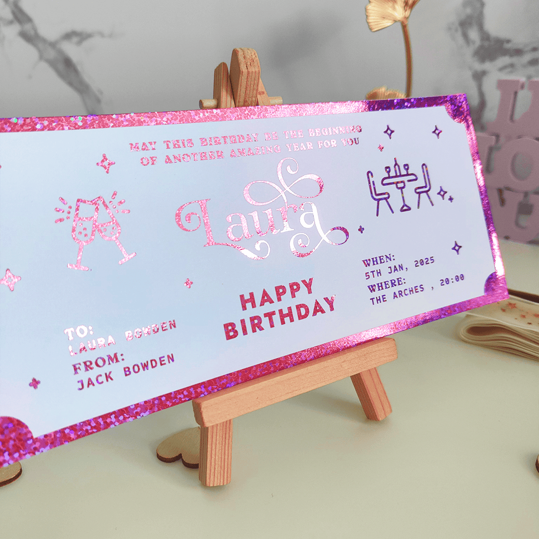 Planning the perfect night out? This Personalized Foil Romantic Dinner Date Ticket adds a touch of magic and elegance to your plans. Whether it’s a birthday surprise, anniversary dinner, or just a special evening together, this luxurious foil ticket makes your invitation truly memorable.