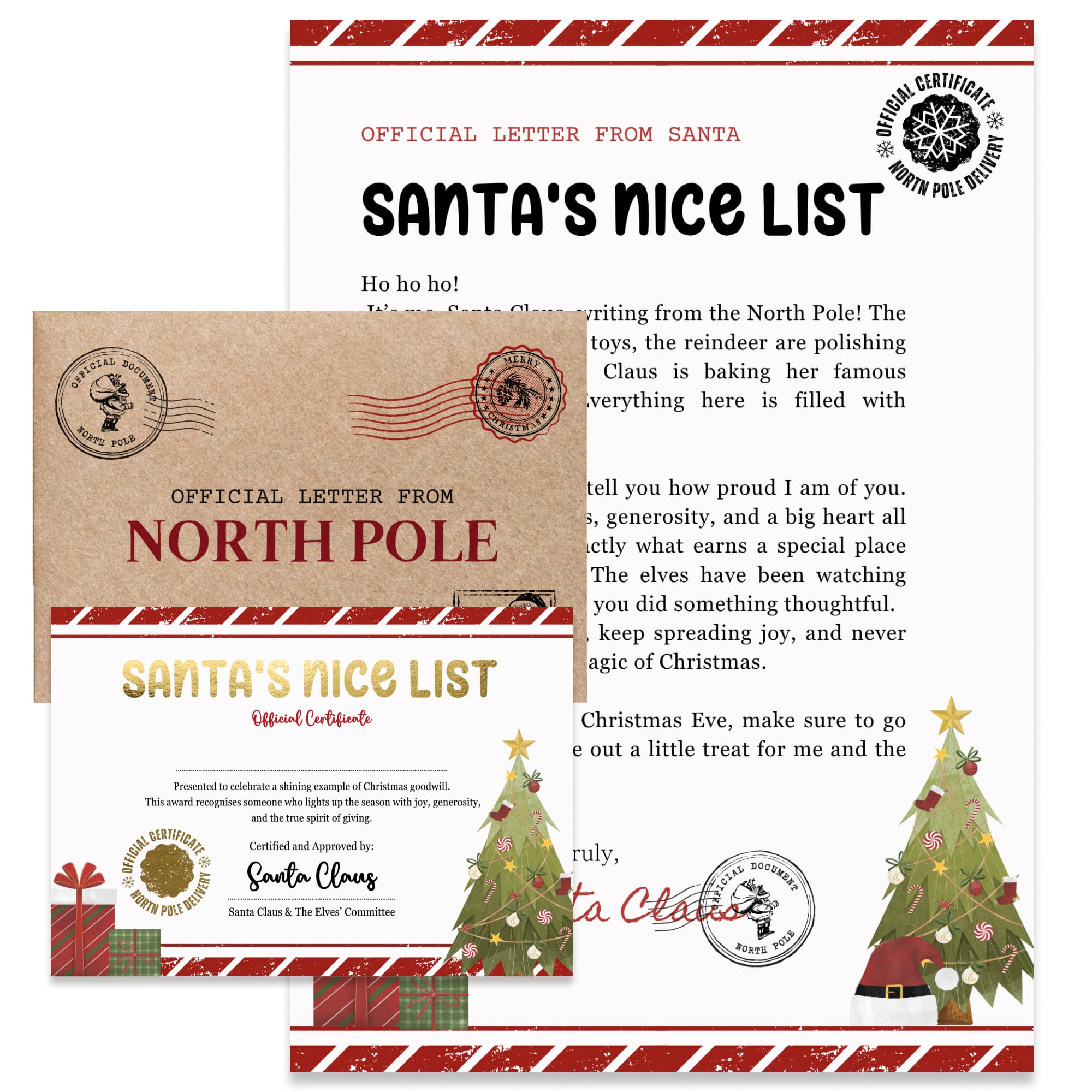 Printed on premium cardstock with red-and-white candy stripe borders and festive illustrations, this set captures the magic of Christmas. Each letter celebrates kindness and good behaviour — the perfect keepsake for children who made Santa’s Nice List this year.