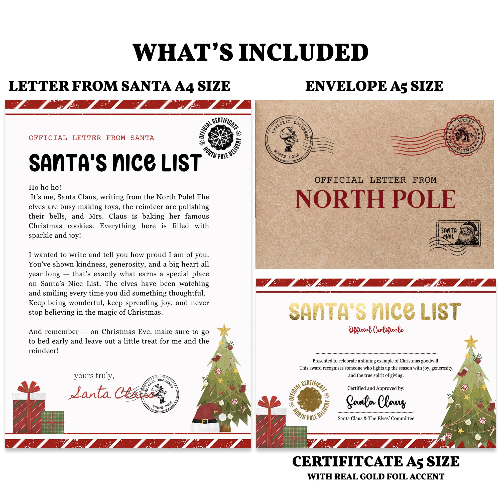 Make Christmas truly special with an Official Letter from Santa, complete with a matching gold-foil certificate and festive kraft envelope. Each set is beautifully printed on premium cardstock, ready to bring the magic of the North Pole straight to your home.
