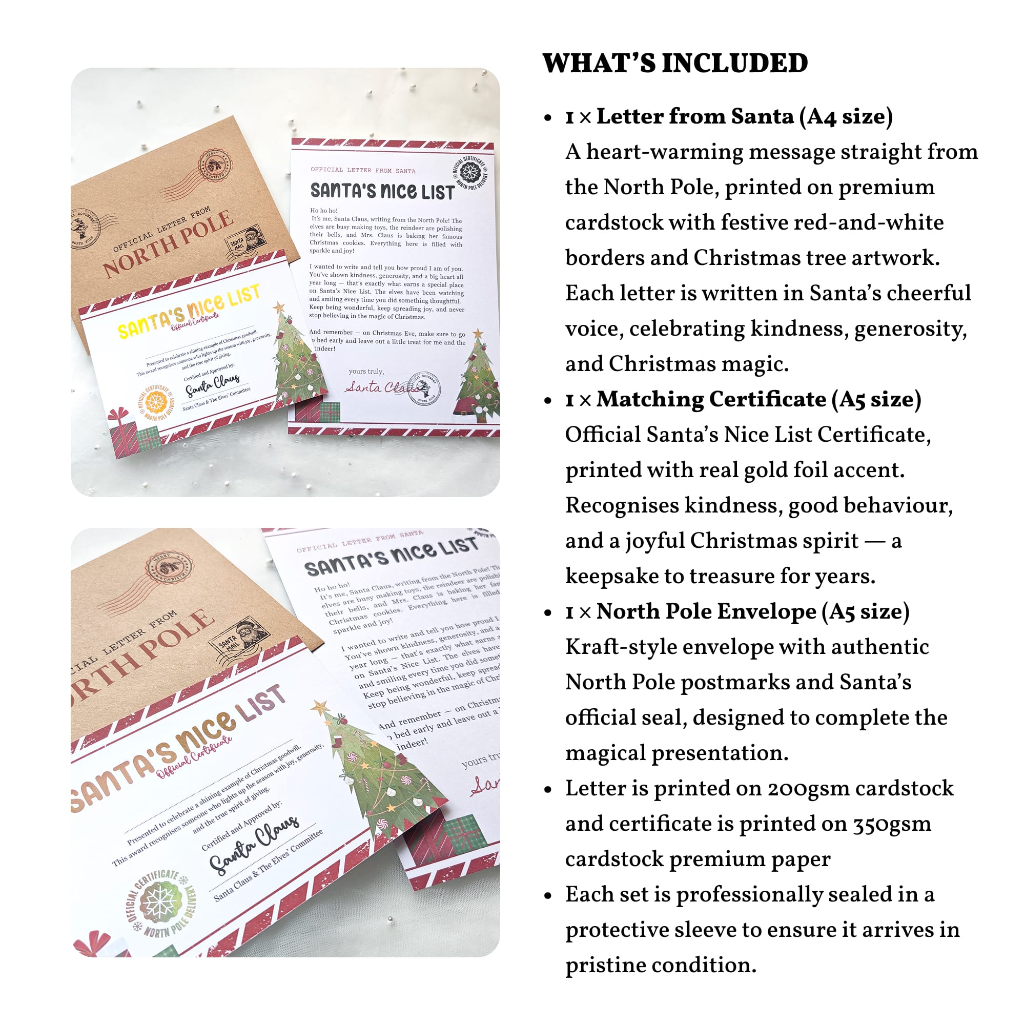 Make Christmas truly magical with the Santa’s Nice List Letter Set — a heartwarming keepsake handmade in Ireland by Printarelle. Each set includes a cheerful letter from Santa Claus, a gold-foil certificate, and a kraft envelope stamped with authentic North Pole postmarks.