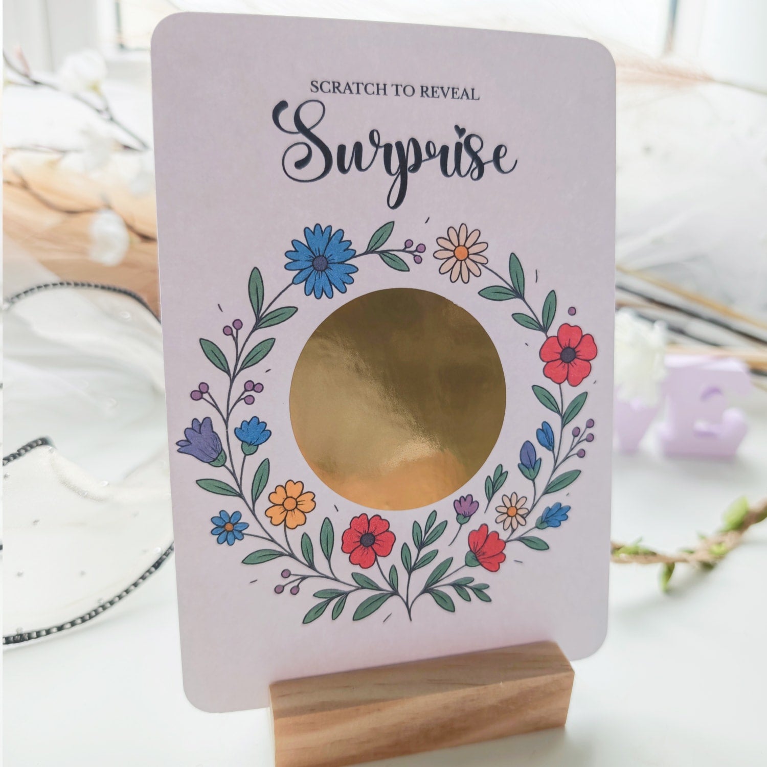 This personalised scratch-to-reveal card is perfect for making any surprise feel special. With a colourful hand-drawn floral wreath and a gold scratch-off sticker, it's a charming way to share your message.