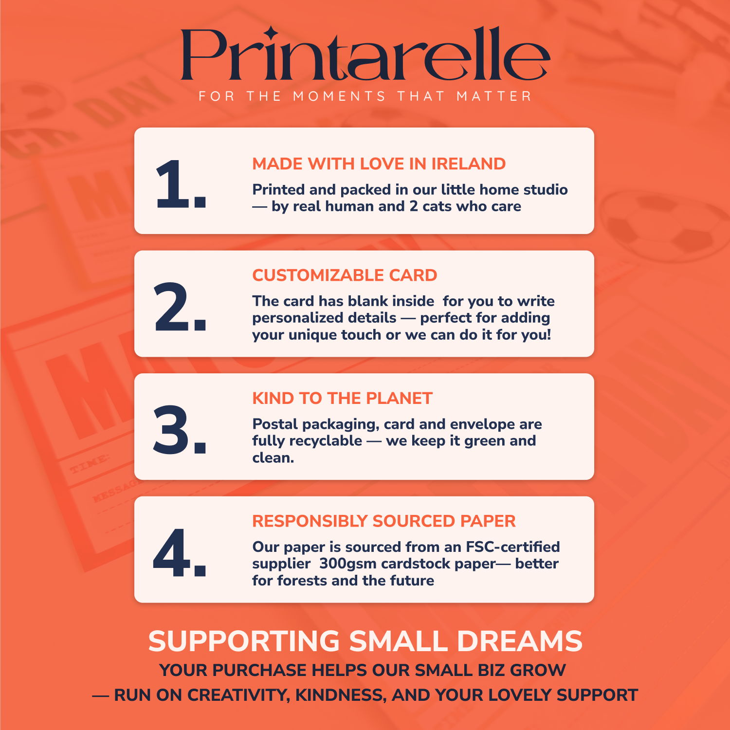 We believe beautiful things should also be meaningful. That’s why each Printarelle card is thoughtfully designed in our small Irish studio and printed on FSC-certified premium cardstock. We pair every card with an eco-friendly kraft envelope and carefully pack each order by hand to ensure it arrives with care.