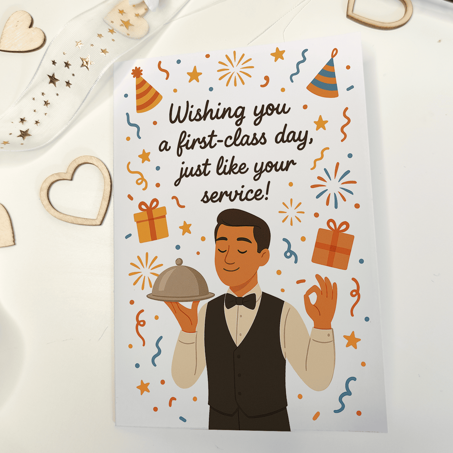 This sophisticated hospitality-themed birthday card is perfect for the hardworking waiter, maître d’, or food service star in your life. With its playful illustration and message—“Wishing you a first-class day, just like your service!”—it’s a charming way to show appreciation and celebrate their big day.