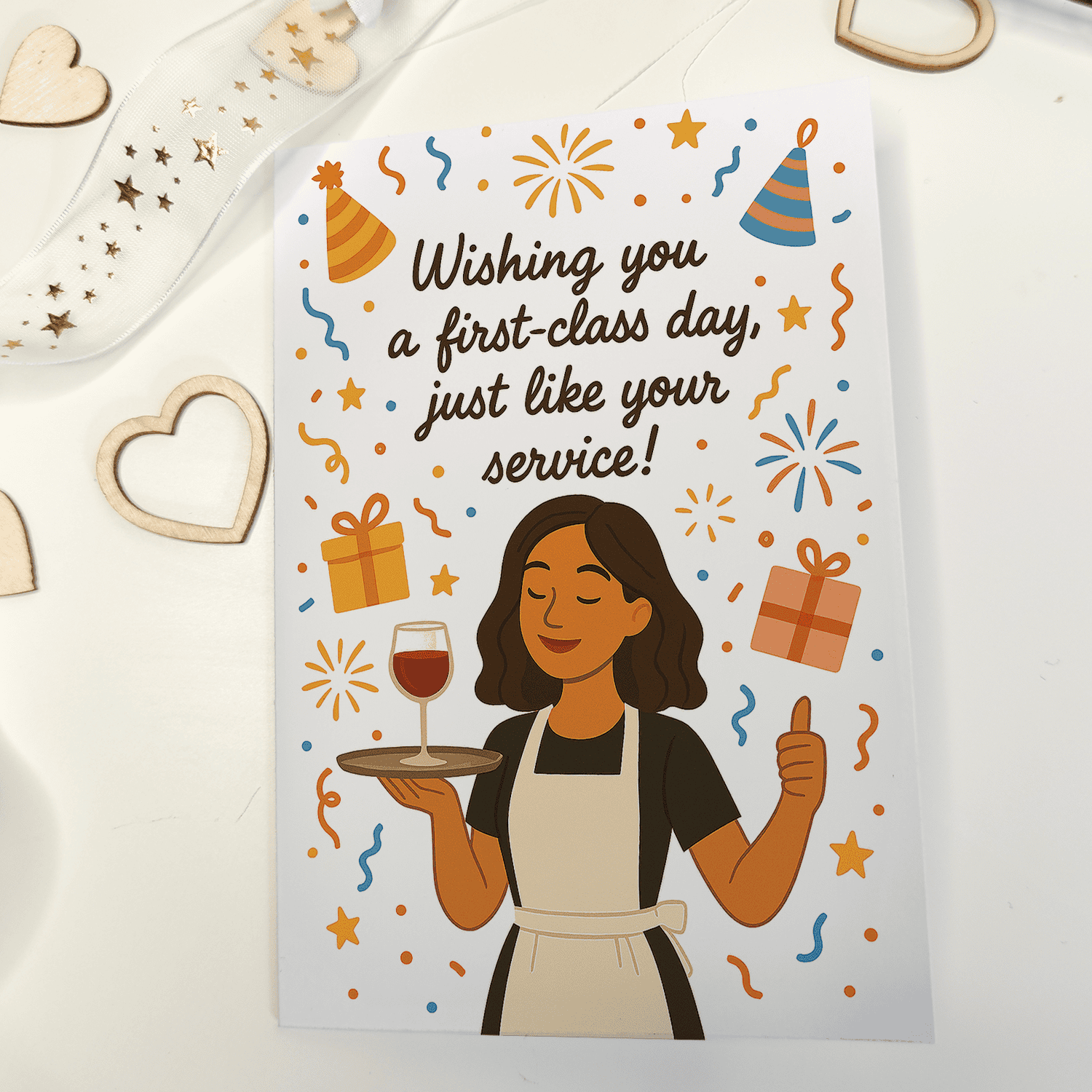 Celebrate someone in the hospitality world with this delightful waitress-themed birthday card. Featuring the cheerful message “Wishing you a first-class day, just like your service!” and a stylish illustrated design, it’s perfect for those who always go above and beyond for others.