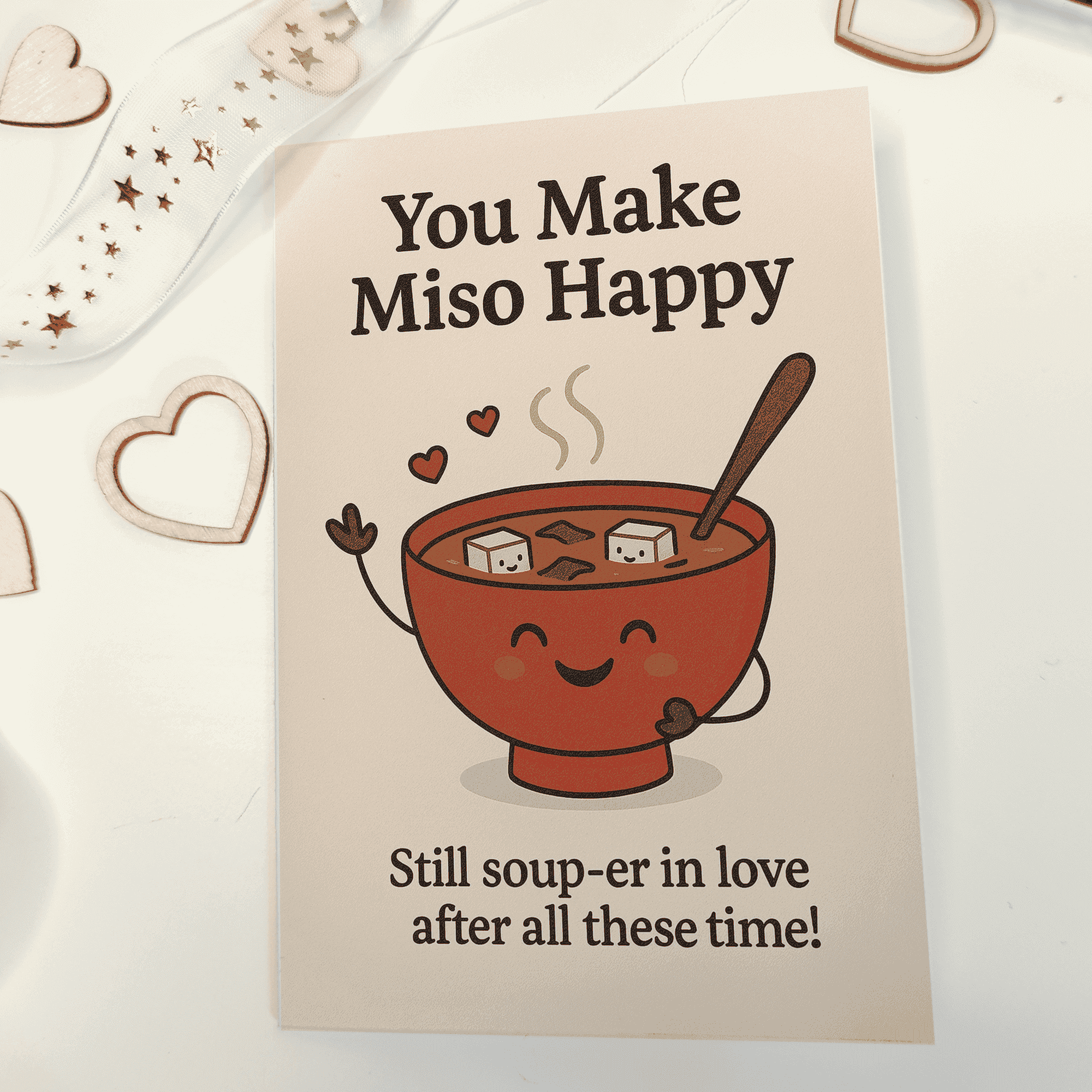 Serve up some love and laughter with this adorable miso soup pun card! With the message “You make miso happy – still soup-er in love after all these time!”, it’s the perfect way to celebrate an anniversary or show affection with a fun foodie twist.