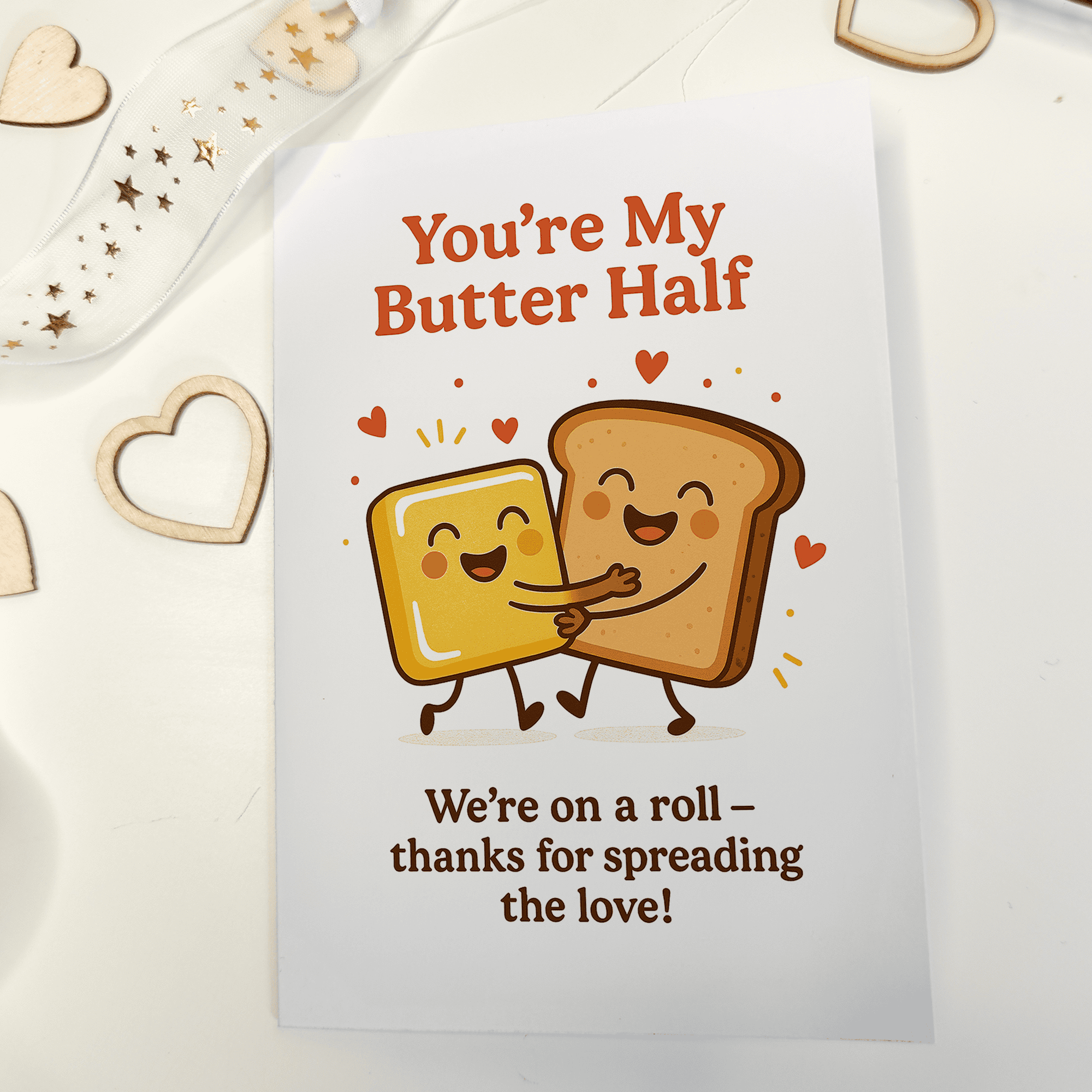 This A6 card is full of heart—and butter! Featuring smiling toast and butter holding hands, plus the pun-filled message “You’re my butter half – we’re on a roll,” it’s the perfect way to show someone they complete you. Ideal for anniversaries, Valentine's Day, or just because.
